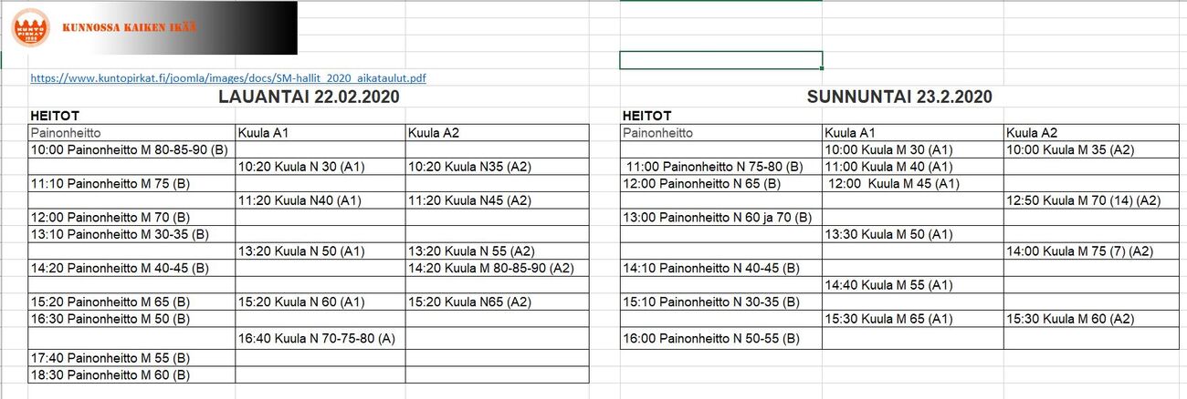 SAULin (järj. Kunto-Pirkat) SM-hallit - heittolajien alustava aikataulu